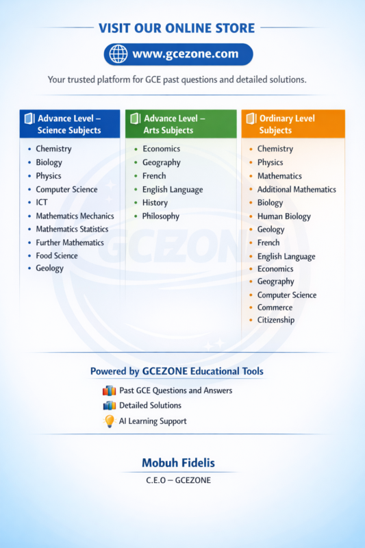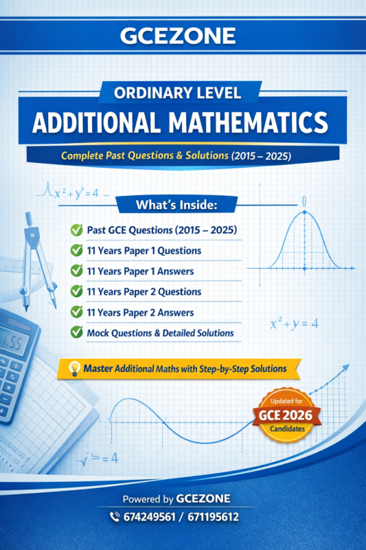 At GCE-Zone, we understand the challenges you face in preparing for the GCE exams. Our mission is to empower students across Cameroon by providing easy access to a comprehensive database of past GCE exam questions and answers for all subjects and years. Whether you’re in Form 5 or upper sixth, our resources are designed to help you succeed.